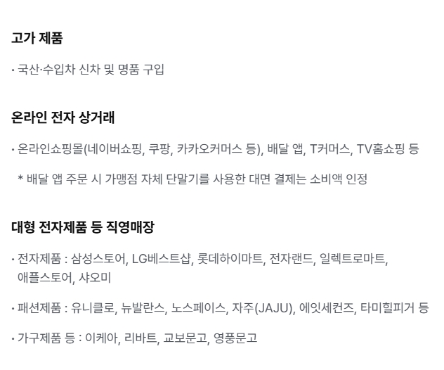 | 제외 가능 | 백화점, 대형마트, 면세점, 일부 온라인 쇼핑몰, 무인·비대면 결제 등(세부 제외처는 공지 확인) |
