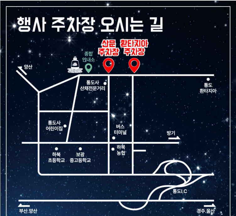 - 주차: 산문 주차장 혼잡 예상, 구(舊) 통도환타지아 주차장 이용 권장
